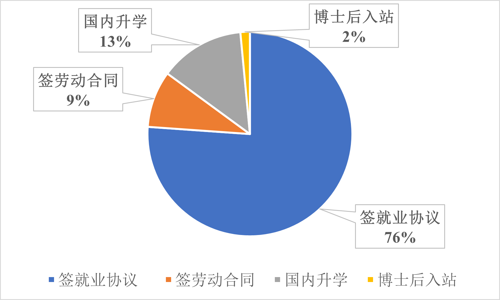 2021届研究生总体毕业去向情况如图1所示,签约单位性质统计如表3所示,从单位性质上看,毕业研究生升学占比13.4%,到国有企业、高等教育单位、科研设计单位和其他事业单位就业占比53.8%,到三资企业就业占比7.4%,到其他企业占比25.4%。