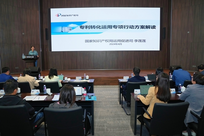 李莲莲做《专利转化运用专项行动方案解读》主题报告,从方案出台的背景、主要任务等方面进行深入讲解,并对中央企业如何做好知识产权工作提出了有关思考和建议。