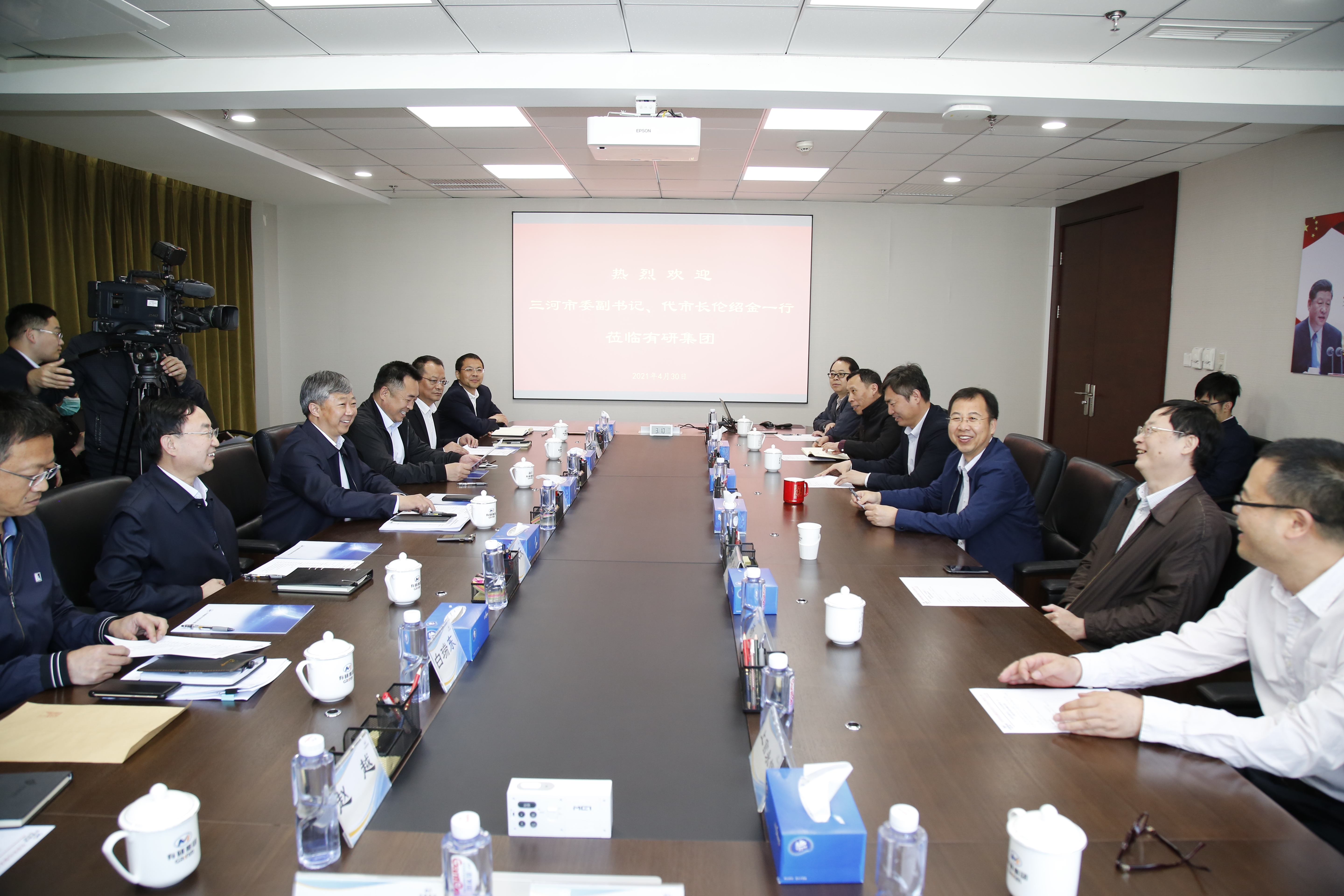 4月30日,三河市委副书记、代市长伦绍金,燕郊高新区党工委书记、管委会主任,市政府副市长雷大庆一行到访有研集团。有研集团党委书记、董事长赵晓晨,副总经理李彦利、王兴权陪同座谈交流。