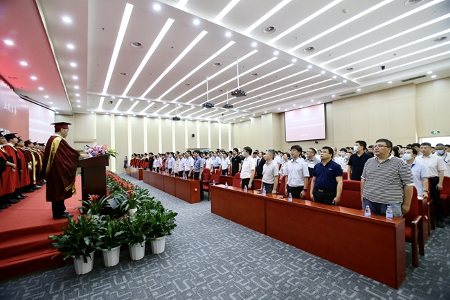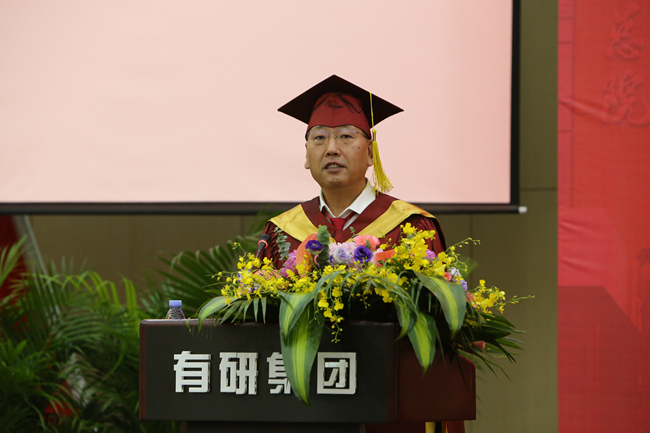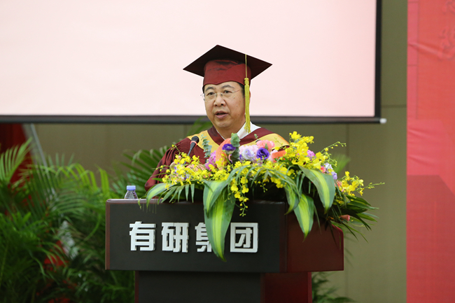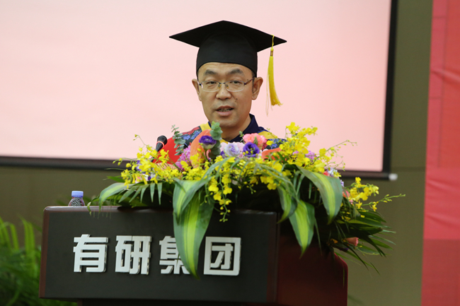 博士生导师樊建中代表导师发言,他围绕有研总院的核心价值观,结合自己20多年的工作经历,鼓励同学们要目标远大,创新为魂;脚踏实地,实干兴邦;诚实守信、立德为先;追求卓越,志存高远。希望全体毕业生终身践行有研总院核心价值观,把握时代脉搏,倾听时代召唤,做新时代的奋斗者。