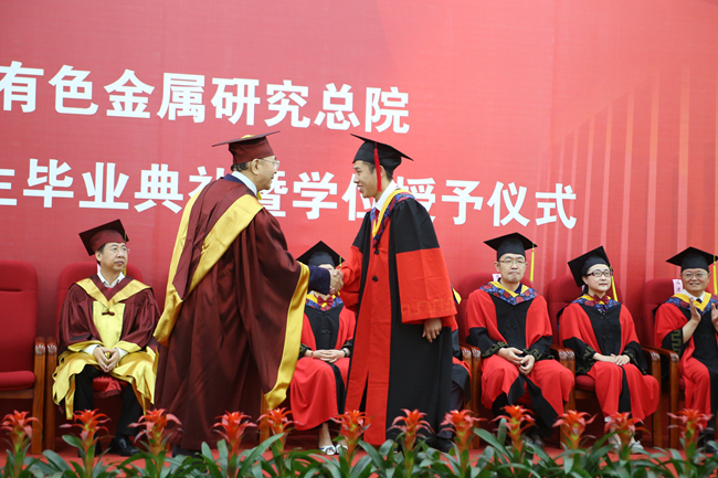 伴随着激昂的乐曲,学位评定委员会委员依次走上主席台,毕业典礼拉开序幕。熊柏青首先宣读了学位评定委员会授予高彤宇等18名同学博士学位、柯灵升等49名同学硕士学位的决定。有研总院名誉院长、学位评定委员会名誉主席屠海令院士,有研总院院长、学位评定委员会主席赵晓晨分别为博士毕业生、硕士毕业生逐一扶正流苏并颁发学位证书。屠海令为获优秀博士学位论文、优秀硕士学位论文的同学及导师颁奖,赵晓晨为获一、二、三等院长奖学金的同学颁奖。