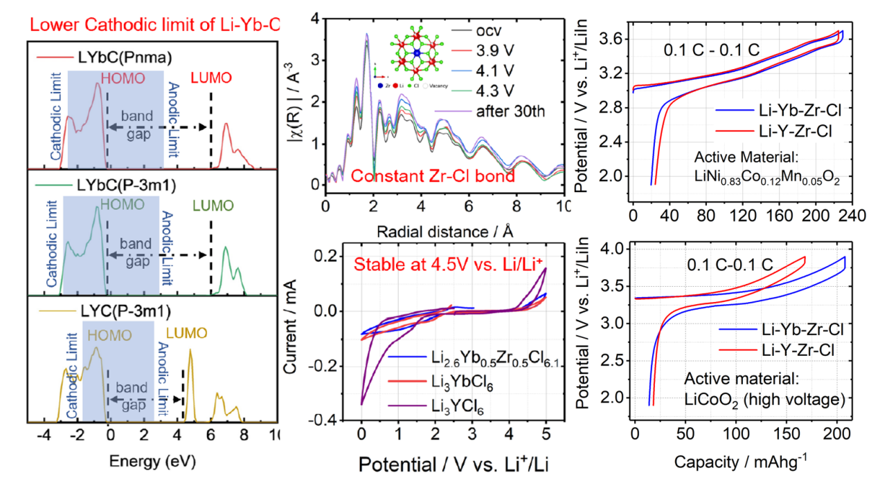 近日,国联研究院创新团队在新型稀土基卤化物固态电解质研究方面再获新成果,成功研发出一种新型多金属氯化物固态电解质。该固态电解质结合了Li-Yb-Cl的高电位和Zr-Cl键的高稳定性,表现出了高达4.5V vs. Li+/Li的氧化稳定电位;通过协同调节Li+载流子和空位浓度进一步提升离子电导率,使得采用该固态电解质的高电压正极材料全固态电池表现出优异的循环寿命和综合电化学性能,为高离子电导率、高电压固态电解质设计及高能量密度全固态电池研发方面提供了新思路,对助推固态电池规模应用具有重要意义。部分成果发表在能源领域著名期刊《Nano Energy》(IF=17.881)上发表,题目是“Origin of High Electrochemical Stability of Multi-Metal Chloride Solid Electrolytes for High Energy All-Solid-State Lithium-Ion Batteries”。