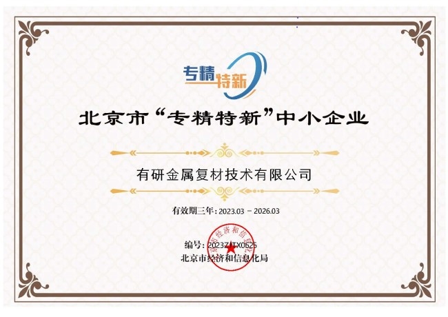近日,有研复材收到北京市经济和信息化局颁发的北京市“专精特新”中小企业证书。