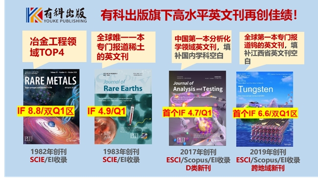 6月28日,科睿唯安发布2022年度《期刊引证报告》(Journal Citation Reports, 简称JCR),有科出版旗下4本英文刊全球影响力继续攀升。其中,Rare Metals以IF8.8荣登全球冶金工程领域第四位(4/78);Journal of Rare Earths以IF4.9稳居全球应用化学类期刊Q1区;Journal of Analysis and Testing和Tungsten首获影响因子,分别以IF4.7和IF6.6位于所在学科Q1区。