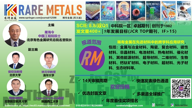 Rare Metals 2022年度影响因子达8.8,同比增长近40%,连续8年创历史新高;在所入选的两个学科均位于Q1区,其中在JCR冶金工程学科(METALLURGY& METALLURGICAL ENGINEERING)中排名为4/78,同比提升2位,在JCR材料科学多学科(MATERIALS SCIENCE, MULTIDISCIPLINARY)中排名为62/345,同比提升35位;总被引频次9122次,同比增长约50%。