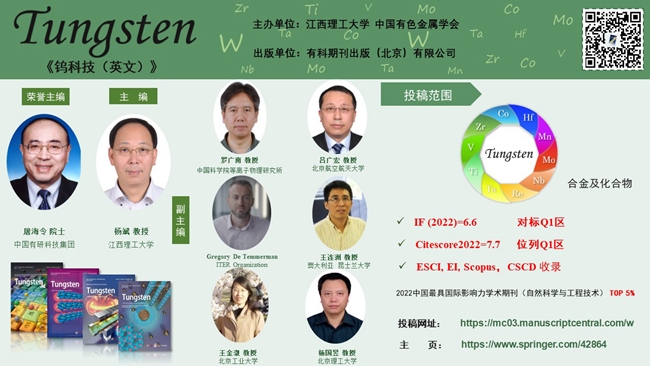 Tungsten 2022年度影响因子6.6,首获影响因子,在JCR材料科学综合学科和应用物理学科(PHYSICALS, APPLIED)分别排名为84/345、31/159,均位于Q1区。
