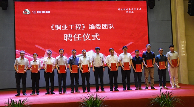 会议举行了科技期刊编委团队聘任仪式。徐政和受聘担任《铜业工程》《cMat》主编,米绪军、中山大学材料学院院长侯仰龙、浙江大学材料科学与工程学院院长朱铁军担任执行主编,罗仙平、易健宏、李周、胡业民、古宏伟、郭耘、谭敦强、解浩峰、汪航、高标、张志佳、兰司等担任编委。徐政和、郑高清、汪波分别颁发了聘书,标志着《铜业工程》《cMat》的核心编委团队正式组建完成。