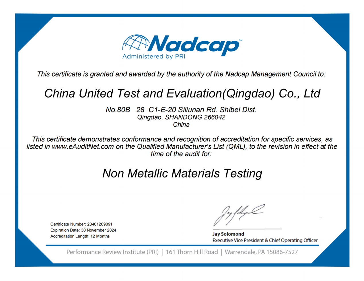 经过多年筹划和精心准备,国合通用(青岛)测试评价有限公司近期通过了NADCAP NMMT(非金属材料)检测实验室认证。加上2020年7月通过的NADCAP MTL(金属材料)检测实验室认证,国合青岛成为全国同时通过NADCAP 金属材料和非金属材料检测实验室认证的五家实验室之一。