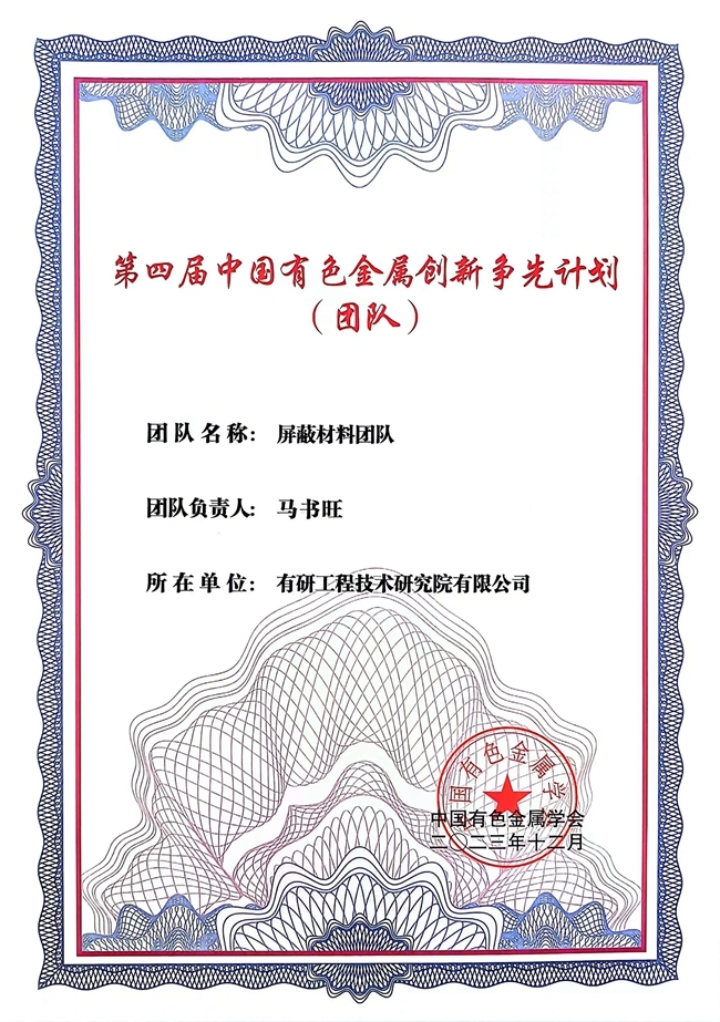 近日,有研工研院屏蔽材料团队荣获“第四届中国有色金属创新争先计划团队”。