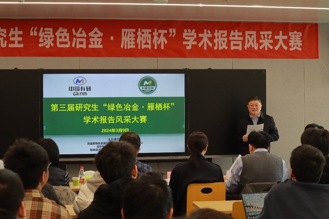 ·····为进一步提高研究生的科学素养,营造活跃的科技创新与学术交流氛围,3月9日,在北京有色金属研究总院研究生院和有研资源环境技术研究院(北京)有限公司指导下,高品质有色金属绿色特种冶金国家工程研究中心举办第三届研究生“绿色冶金·雁栖杯”学术报告风采大赛。研究生院副院长冯雪;有研资环院总经理姚国成,副总经理王星明、刘玉柱、向宇出席会议。有研资环院各事业部负责人、科研骨干、研究生等50余人参与活动。大赛由绿色冶金国家工程研究中心主任温建康主持。