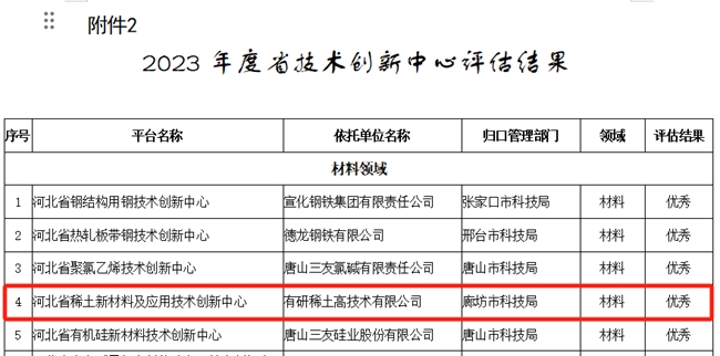 日前,河北省科技厅发布了《关于公布2023年度省重点实验室、技术创新中心绩效评估与验收工作结果的通知》,依托有研稀土公司建设的“河北省稀土新材料及应用技术创新中心”(以下简称中心)在2023年度绩效评估中被评为“优秀”。