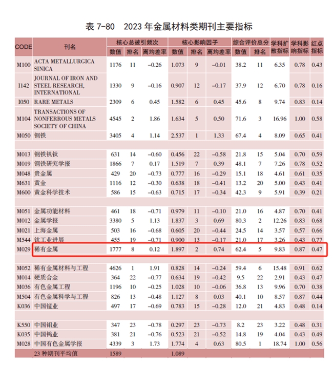 9月20日,由中国科学技术信息研究所主办的“2024年中国科技论文统计结果发布会暨中国一流科技论文世界影响力评价论坛”在北京召开。根据会议发布的《中国科技期刊引证报告》,《稀有金属》2023年度核心影响因子(CJCR)为1.897,较2022年度(1.751)提升8%,位列金属材料学科第二(2/23)。