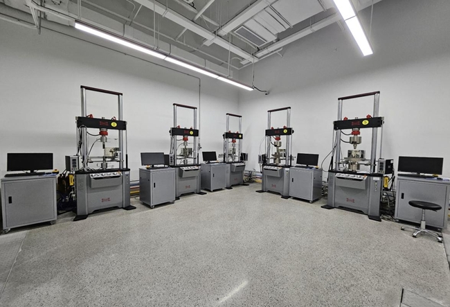在一楼紧挨着的两个低周疲劳实验室,数十台实验机器正在反复进行周期性加载,考验材料在循环载荷的作用下的抗疲劳表现,评价材料的疲劳寿命、断裂韧性、裂纹扩展速率等关键性能指标。“我们平行地设立两个实验室,分别布置国外进口和国内自研设备,通过样品的比对试验来验证国产设备的测试精度,目前仍在不断推动大批量、长周期的样品比对来验证国产设备的稳定性、可靠性,助力国产测试设备产业发展。”李杨解释,过去新材料行业各链路环节都面临国外技术“卡脖子”的问题,如今国产设备、传感器等已在一步步突破,从跟跑到并跑,但仍需要不断创新发展,以实现超越领跑。