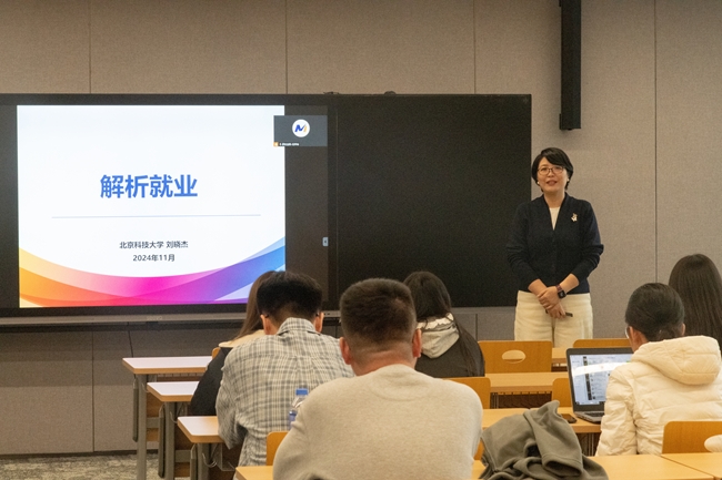 活动伊始,北京科技大学招生就业处副处长、学生就业指导中心主任刘晓杰为研究生带来了“就业形势及求职技能”专题分享。她全面地剖析了当前毕业生就业现状,并从简历撰写、面试等方面提供了具体技巧与方法指导。