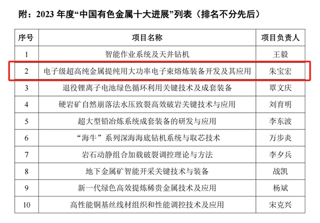 所属有研工研院“电子级超高纯金属提纯用大功率电子束熔炼装备开发及其应用”项目成功入选。