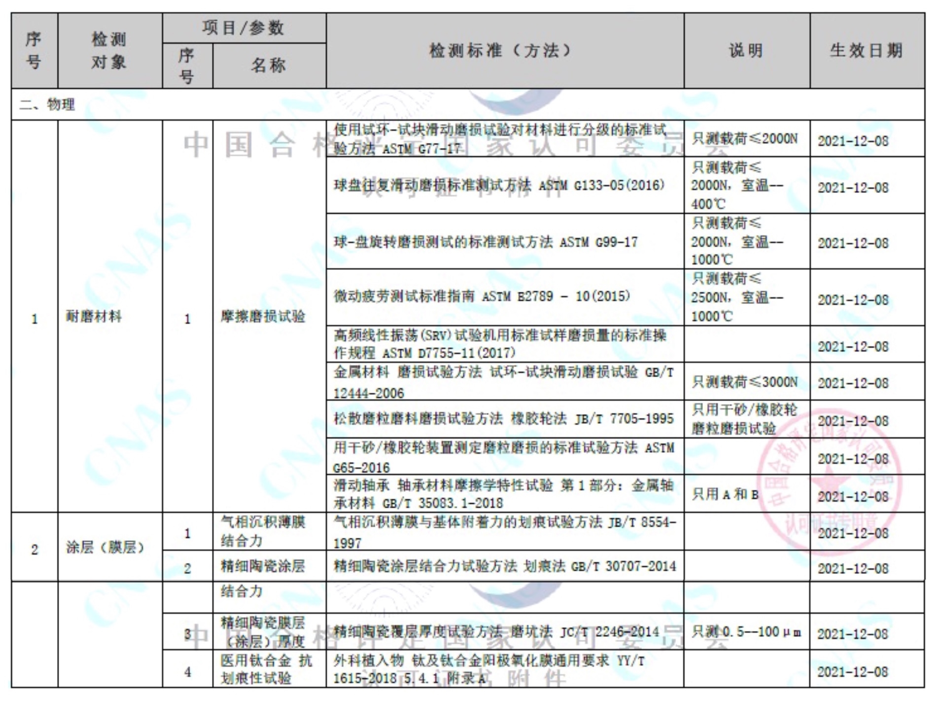 2021年12月,国合通测顺利通过摩擦磨损、力学和环境可靠性技术领域的CNAS和CMA扩项评审。摩擦磨损实验室获得了摩擦磨损试验、膜层(涂层)结合力、膜层厚度、抗划痕性试验等5个检测项目的13项标准方法的CNAS和CMA认可,成为国内拥有摩擦磨损检测资质的权威第三方机构。