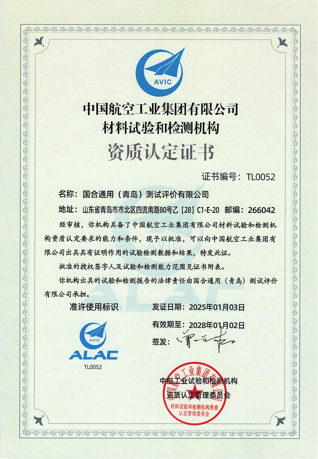 近日,国合通用(青岛)测试评价有限公司顺利取得中国航空工业集团有限公司材料试验和检测机构资质认证(ALAC)证书。至此,国合青岛已相继取得CMA、CNAS、NADCAP((MTL/NMMT)、航空领域特殊过程评价ASP((MTL/NMMT)、航空工业ALAC(MM/CM/NM)、中国航发AECC(MTL)等检测资质,成为国内航空材料检测资质覆盖最全的机构之一。