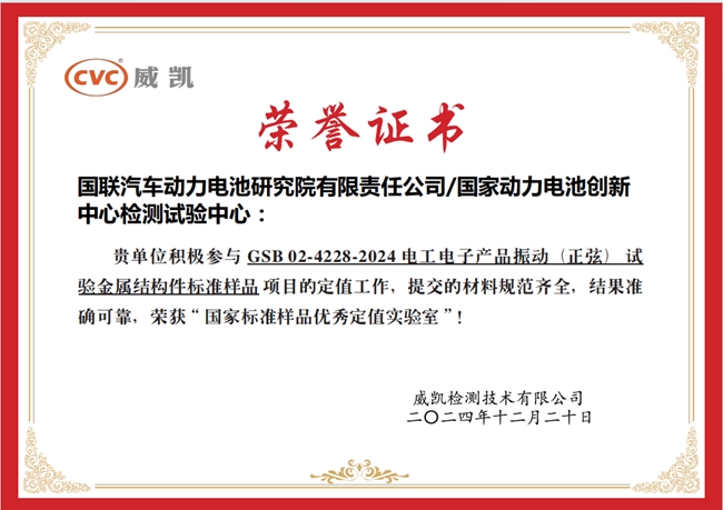 标准样品是实物标准,是保证标准在不同时间和空间实施结果一致性的参照物,具有均匀性、稳定性、准确性和溯源性,是实施文字标准的重要技术基础,是标准化工作中不可或缺的组成部分。作为中国电研CVC威凯协作实验室成员,国联研究院参与了其研制的“电工电子产品振动(正弦)试验金属结构件标准样品”项目,国联研究院为项目提供了规范严谨、结果准确可靠的定值服务和数据材料,项目已于近日成功通过验收。国联研究院获聘“国家标准样品协作定值实验室”,荣获“国家标准样品优秀定值实验室”,体现了中国电研CVC威凯高度认可国联研究院在项目定值工作中的突出贡献,同时也有力说明国联研究院在复杂工况测试与标准化研究中具备较强检测能力、技术领先性和数据权威性。