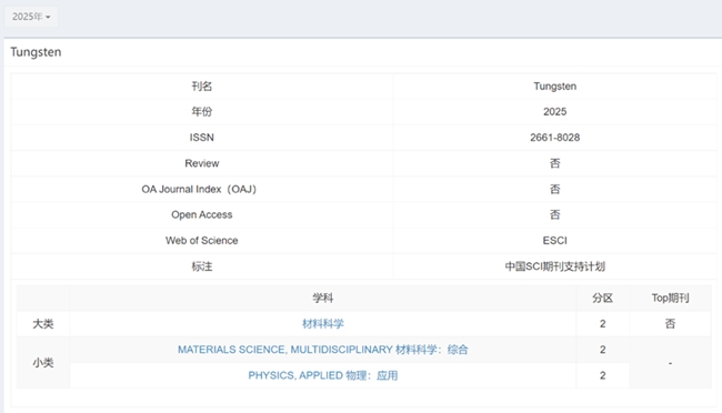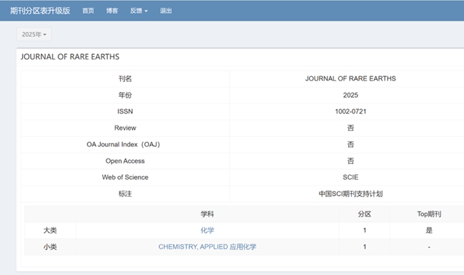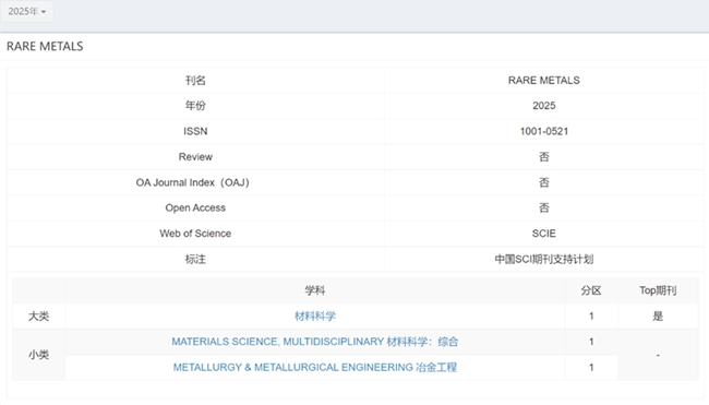 3月20日,《2025年中国科学院文献情报中心期刊分区表》正式发布。有科出版负责出版的RARE METALS(《稀有金属(英文版)》)、Journal of Rare Earths(《稀土学报(英文)》)继续稳居1区、入选Top。Journal of Analysis and Testing(《分析检测(英文)》)新晋1区Top,Tungsten(《钨科技(英文)》)新晋2区,英文期刊影响力提升取得了新的突破。