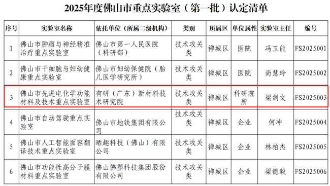 近日,佛山市科学技术局公布2025年度佛山市重点实验室(第一批)认定清单,有研广东院获批佛山市先进电化学功能材料及技术重点实验室。
