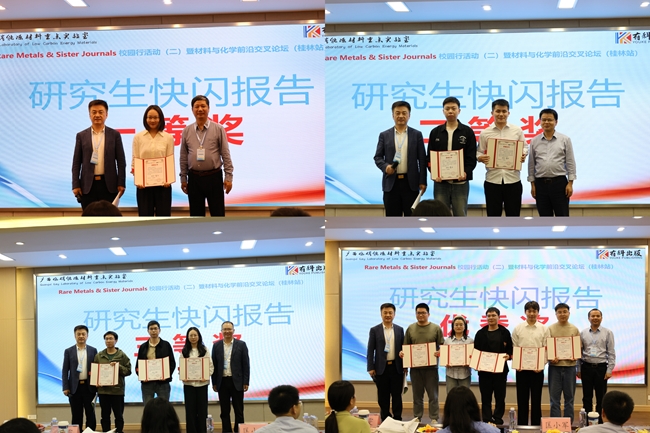 侯仰龙为Rare Metals期刊2025年新聘任学术副主编、青年编委颁发了聘书。来自13所高校和科研院所的学者围绕会议主题,对相关领域研究进展及未来应用展望作专题报告。参会师生踊跃提问、互动热烈。来自广西师范大学、桂林电子科技大学、桂林理工大学的11位研究生分享了所负责研究课题的 “快闪报告”,赢得了评委和观众的一致好评。