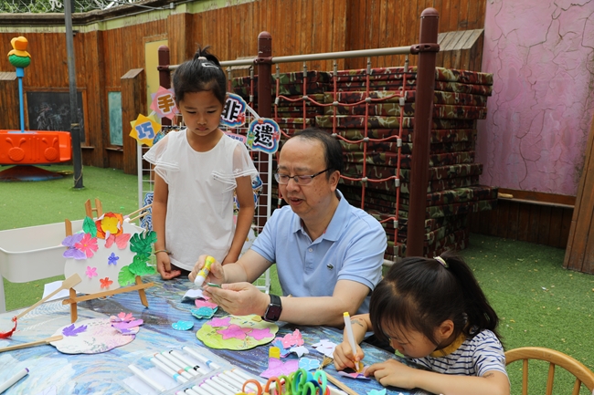 毛昌辉一行先后走进幼儿园多功能厅、户外活动场地,来到孩子们身边,观看了“古诗吟唱”“巧手探非遗”“跳竹竿舞”“面部彩绘”等丰富多彩的迎“六一”活动,并参与了“非遗团扇制作”,和孩子们一起欢庆节日。