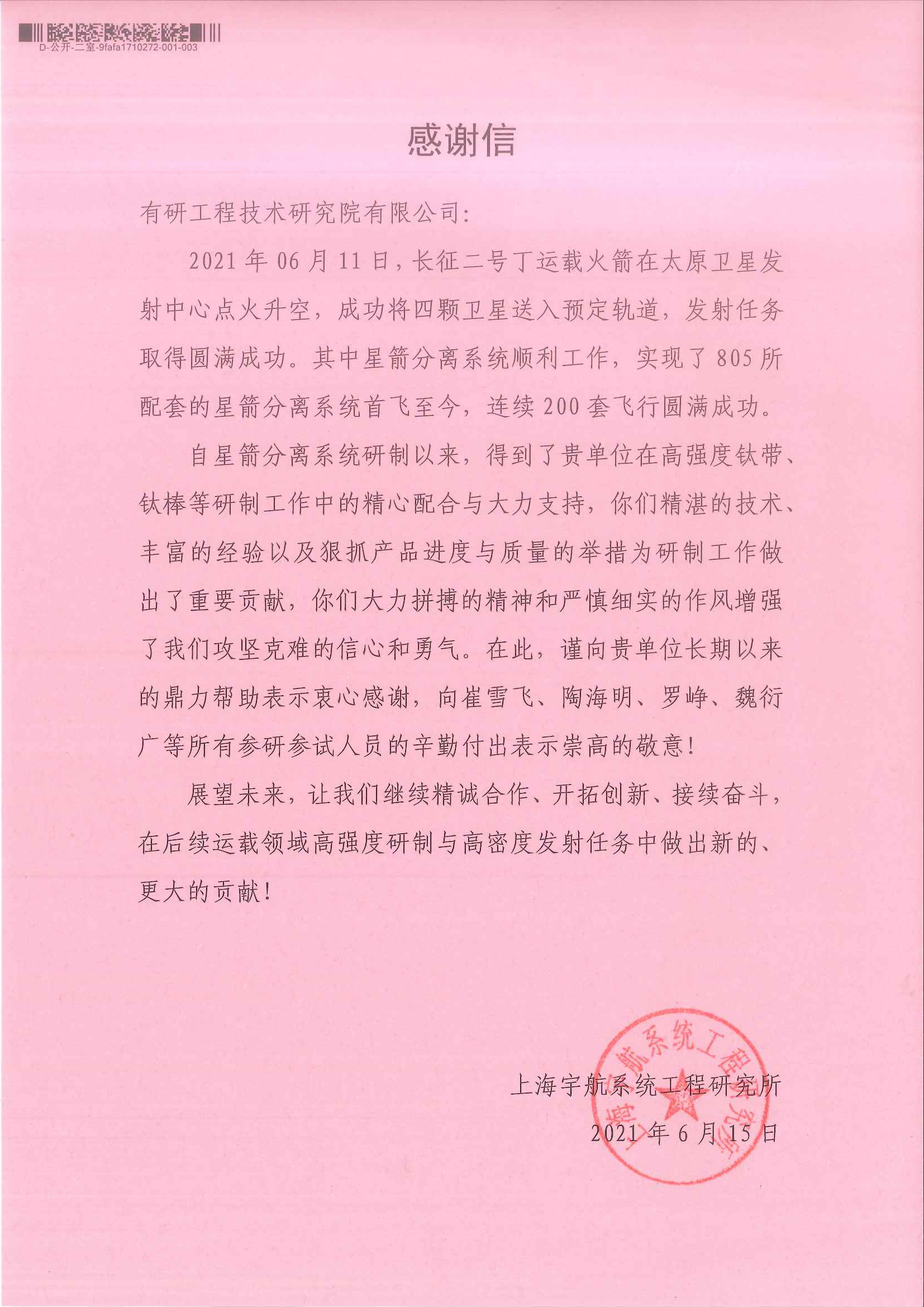 有研工程技术研究院有限公司有色金属结构材料事业部钛合金研究所作为星箭分离系统参研参试单位,为星箭分离系统提供了关键配套材料保障,研发的关键部件成功应用于资源、气象、通讯、导航及海洋卫星星箭分离系统,实现了300余颗卫星的安全解锁。在中国共产党成立100周年之际,实现了星箭分离系统连续200套飞行圆满成功,上海宇航系统工程研究所特为有研工程技术研究院有限公司发来感谢信和纪念章!