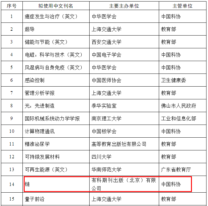 2021年9月26日,中国科学技术学会发布了《关于下达2021年度中国科技期刊卓越行动计划高起点新刊入选项目的通知》。根据《关于申报2021年度中国科技期刊卓越行动计划高起点新刊项目的通知》,按照《中国科技期刊卓越行动计划实施方案》和《中国科技期刊卓越行动计划评审细则》,经项目申报、资格审查(166项通过)、项目评审(92项进入终评)、结果公示,产生了入选项目共计30项,有科期刊出版(北京)有限公司主办的新刊Chain(《链》)成功入选。