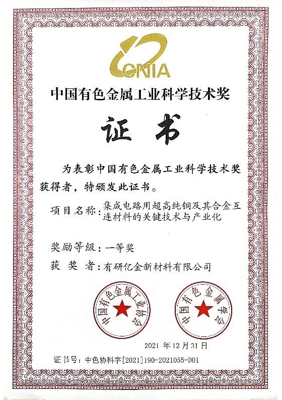 近期,中国有色金属工业协会、中国有色金属学会联合发布了《关于颁发2021年度中国有色金属工业科学技术奖的通知》,有研亿金新材料有限公司(简称有研亿金)主持完成的《集成电路用超高纯铜及其合金互连材料的关键技术与产业化》项目荣获中国有色金属工业科学技术奖一等奖。