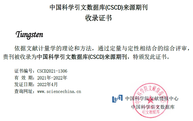 4月19日,由有科出版运营出版,中国有色金属学会和有研集团共同主办的《分析检测(英文)》及江西理工大学和中国有色金属学会共同主办的《钨科技(英文)》被中国科学引文数据库(CSCD)正式收录。