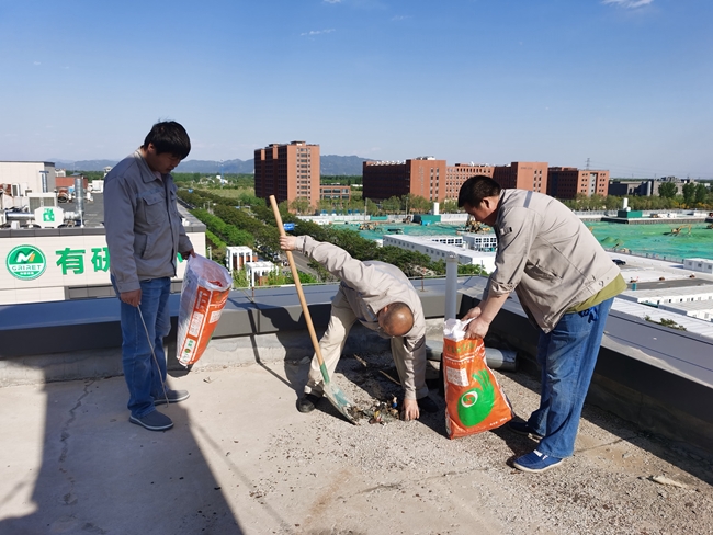 在怀柔园区,工作人员清洗楼宇墙面,清理维护循环水系统,并对室外地面、配电设施及动力站等逐一进行安全排查,及时进行维护保养;在二部园区,为应对即将到来的用电高峰及雨季,工作人员及时开展了配电设施检修和供电线路维护,确保夏季供电可靠和安全运行;在北太园区,为保证夏季空调正常运行,工作人员及时开展了空调机的维护、清洗工作,既提高了空调制冷效果,又有效改善了空气质量。