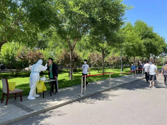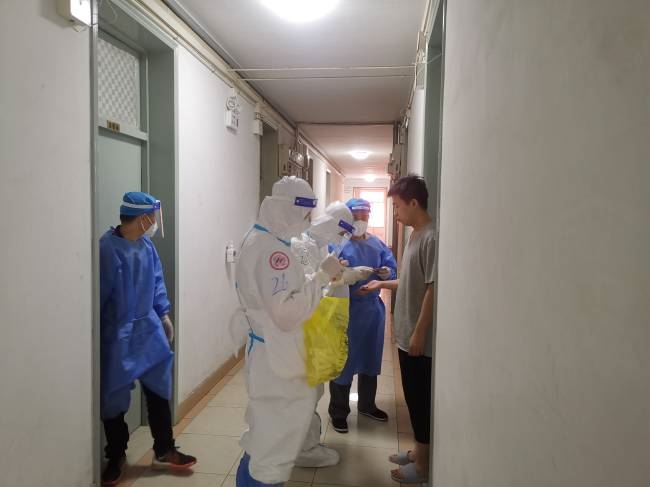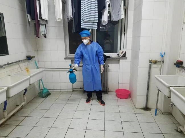 在北太园区,9:00,北太园区工作人员协助核酸检测人员为单身公寓的学生进行检测;10:30,工作人员对单身公寓的快递外卖进行消杀转运;14:00,工作人员对单身公寓公共区域进行日常消杀,小区封控以来,北太园区职工每两小时对公共区域进行一次消杀;17:00,工作人员对单身公寓垃圾进行消毒后进行处理。