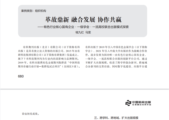 鉴古以知今,彰往而查来。近日,我国首部新闻出版深度融合发展纪年文献——《中国新闻出版深度融合发展年鉴》(2021年卷),由中国出版集团研究出版社出版,向海内外公开发行,新华网、光明网等主流媒体进行了宣传报道。有科出版深度融合创新案例《革故鼎新 融合发展 协作共赢——有色行业核心国有企业•一级学会•一流高校联合出版模式探索》成功入选。