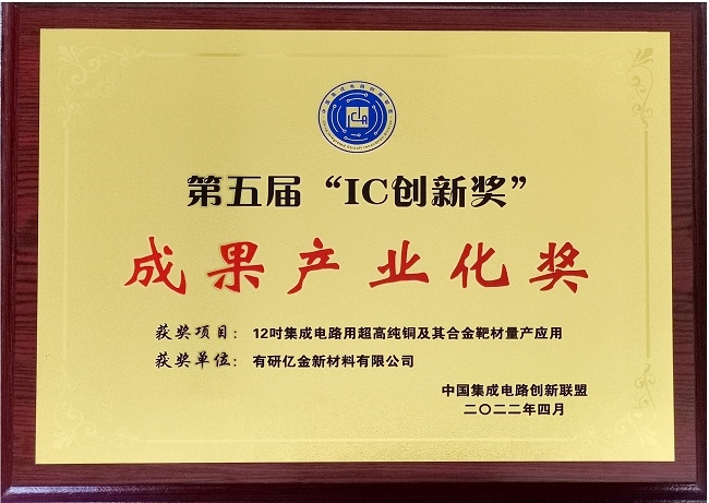 2022年7月9日,中国集成电路行业最具影响力的“2022中国集成电路创新联盟大会”举行,会上颁发了第五届集成电路产业技术创新奖(简称“IC创新奖”)。有研亿金凭借“12吋集成电路用超高纯铜及其合金靶材量产应用”项目荣获第五届“IC创新奖-成果产业化奖”。