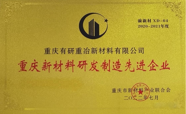 2020年重庆市新材料产业联合会为加快新材料产业集群建设,高度重视研发及调动新材料企业的创造性和积极性,组织开展了2020-2021年度“重庆新材料研发制造先进企业”评选活动。近年来,有研重冶在新材料领域研发投入上不断发力,正在实施的“粉体材料基地建设项目”获“中国工业大奖提名奖”,“铜粉绿色自动化制备技术及产业化”获“中国有色金属工业科学技术奖一等奖”,深耕装备制造能力提升。