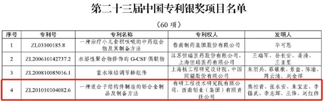 近日,国家知识产权局发布了《国家知识产权局关于第二十三届中国专利奖授奖的决定》,有研集团有研工研院主持完成的发明专利“一种适合于结构件制造的铝合金制品及制备方法”获得第二十三届中国专利银奖。
