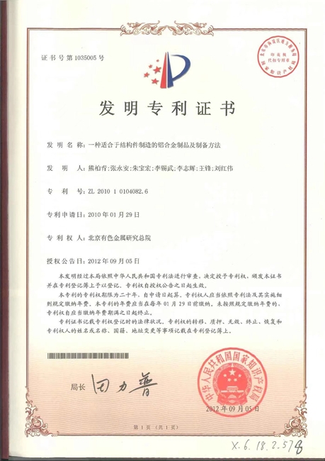 该项发明于2012年9月获国家知识产权局授予发明专利权(专利号为201010104082.6),并在美国、日本、欧洲等11个国外航空铝材主要生产制造国获得授权。该专利可实现大厚度高性能铝合金板材和锻件等产品的生产制造,产品综合性能全面达到国际国内相关标准要求,且部分关键指标优于国外同类产品实物,填补了国内空白,解决了“卡脖子”问题,实现了航空领域核心关键材料自主可控。