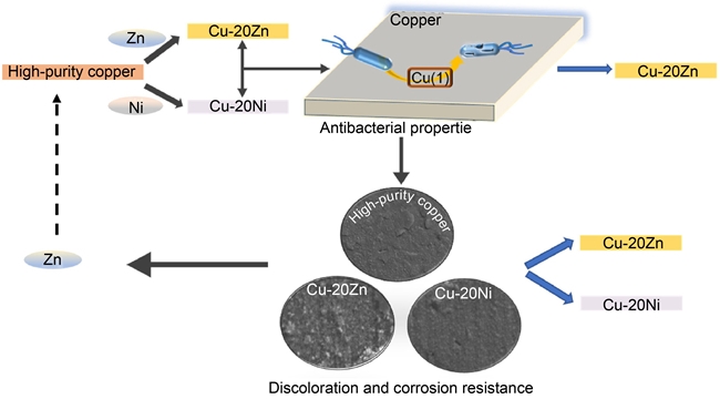 有色金属材料制备加工国家重点实验室的米绪军教授课题组完成,对Zn/Ni元素添加对抑菌铜材料抗菌和耐蚀性能影响进行研究,为后续抑菌铜材料成分优化提供数据支持和理论依据。