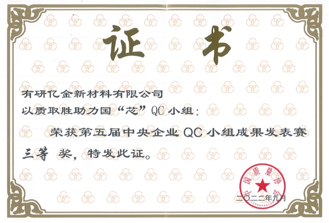 9月22日,中国质量协会第五届中央企业QC小组成果发表赛传来喜讯,有研亿金《12英寸集成电路用高纯Co溅射靶材核心关键技术研发》QC成果荣获第五届中央企业QC小组成果三等奖。