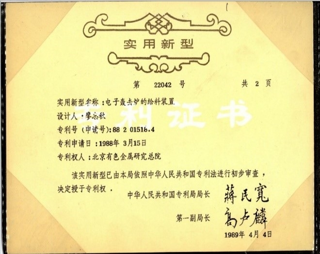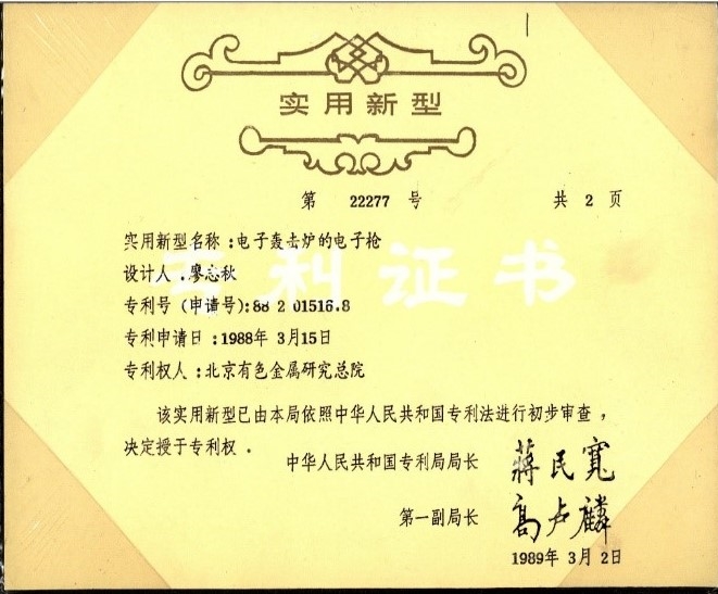 此后,为了解决环状电子枪的技术不足,有研集团的先辈们创新性地改进了电子枪技术,研制出功率更高的电磁聚焦电子束炉,独立自主地设计出进料和拖锭机构,为当时三线工厂提高生产率作出了重要贡献。1978年,超高真空电子束区域熔炼炉获全国科学大会奖。1989年,电子轰击炉的电子枪和给料装置获得国家实用新型发明专利。