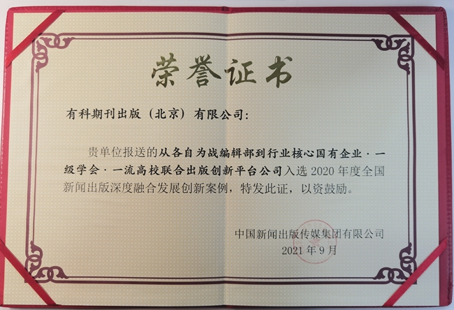 有科出版“从各自为战编辑部到行业核心国有企业·一级学会·一流高校联合出版创新平台公司”入选中宣部中国新闻出版传媒集团组织的2020年度全国新闻出版深度融合发展创新案例。