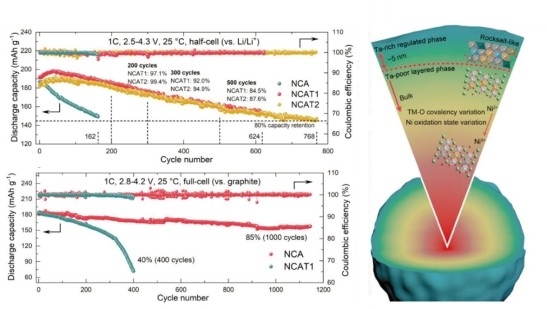 国家动力电池创新中心创新团队牢记以技术创新引领行业高质量发展使命,保持深耕细作、求真务实科研作风,围绕行业共性技术需求,不断提升技术服务能力,服务新能源汽车行业应用需求。针对高比能动力电池在安全、寿命、成本等方面存在的问题,创新团队通过多维度调研分析,找准共性问题,开展电池检测验证、机理解析,确定关键技术因素。经过多轮次研讨,从电池关键材料着手,精细设计核壳梯度正极材料结构,引入电子态掺杂技术,开发表面改性新方法。经过一年多的技术攻关,从材料设计、实验研究验证到工程化技术开发,批量试制成功性能优异的高镍正极材料。所开发材料兼顾了稳定表面结构、良好电荷传递性能,具备优异的热稳定性和循环稳定性,实现低成本工程化,行业专家鉴定达到国际先进水平。部分研究成果以论文形式发表于能源领域国际顶级学术期刊Small (IF=15.153), 题目为“Structure and Charge Regulation Strategy Enabling Superior Cyclability for Ni-Rich Layered Cathode Materials”。