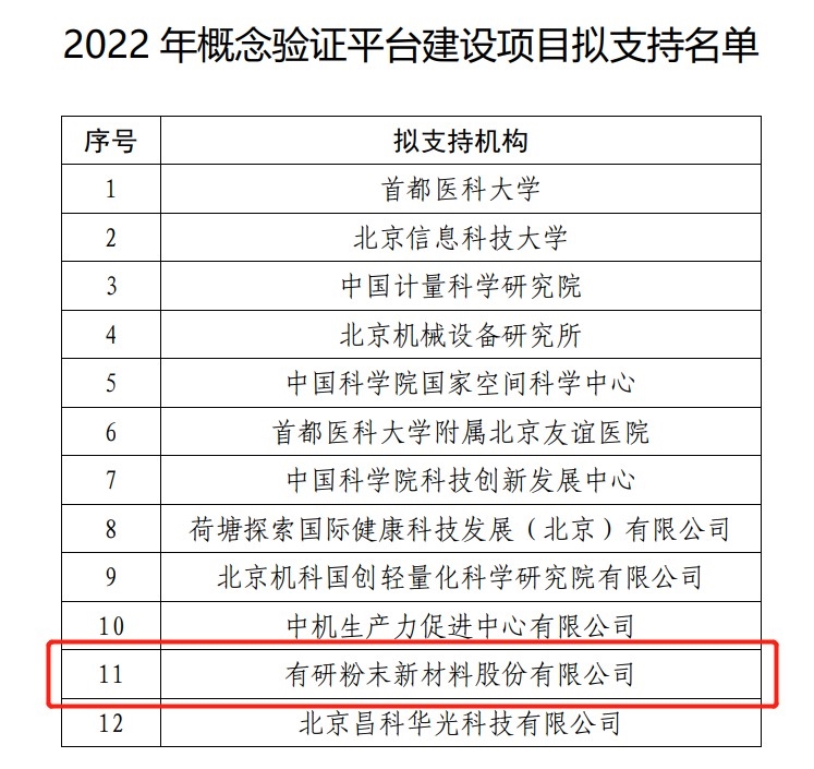 近日,北京市科委、中关村管委会公布“2022年概念验证平台建设项目支持名单”,共批准设立首批概念验证平台12家,其中企业单位5家,有研粉材“金属粉体材料概念验证平台”成功入选。这是有研粉材获批工信部金属粉体材料产业技术研究院、北京市金属粉末工程技术研究中心等又一科技创新成果转化平台。