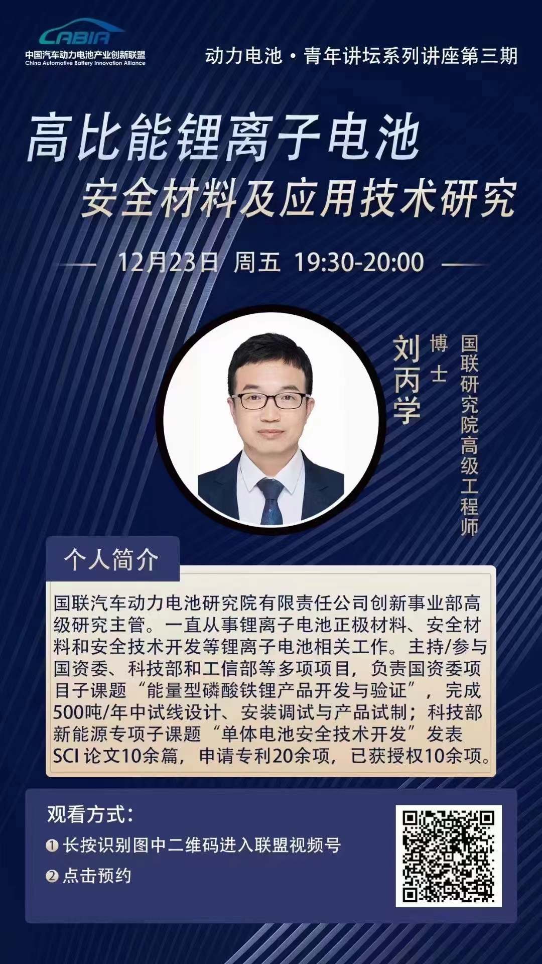 12月23日,国家动力电池创新中心“动力电池·青年讲坛”系列讲座第三期以线上直播方式开讲。本期讲座邀请国联研究院创新事业部高级研究主管刘丙学博士专题分享高比能锂离子电池安全材料及应用技术研究相关内容,互动交流探讨安全添加剂材料设计及应用、安全电解液设计及应用、高比能电池安全技术集成等方面的知识,为动力电池安全材料及应用技术研究提供思路。来自企业、行业机构、科研院所等专业人士500余人线上参加讲座直播。