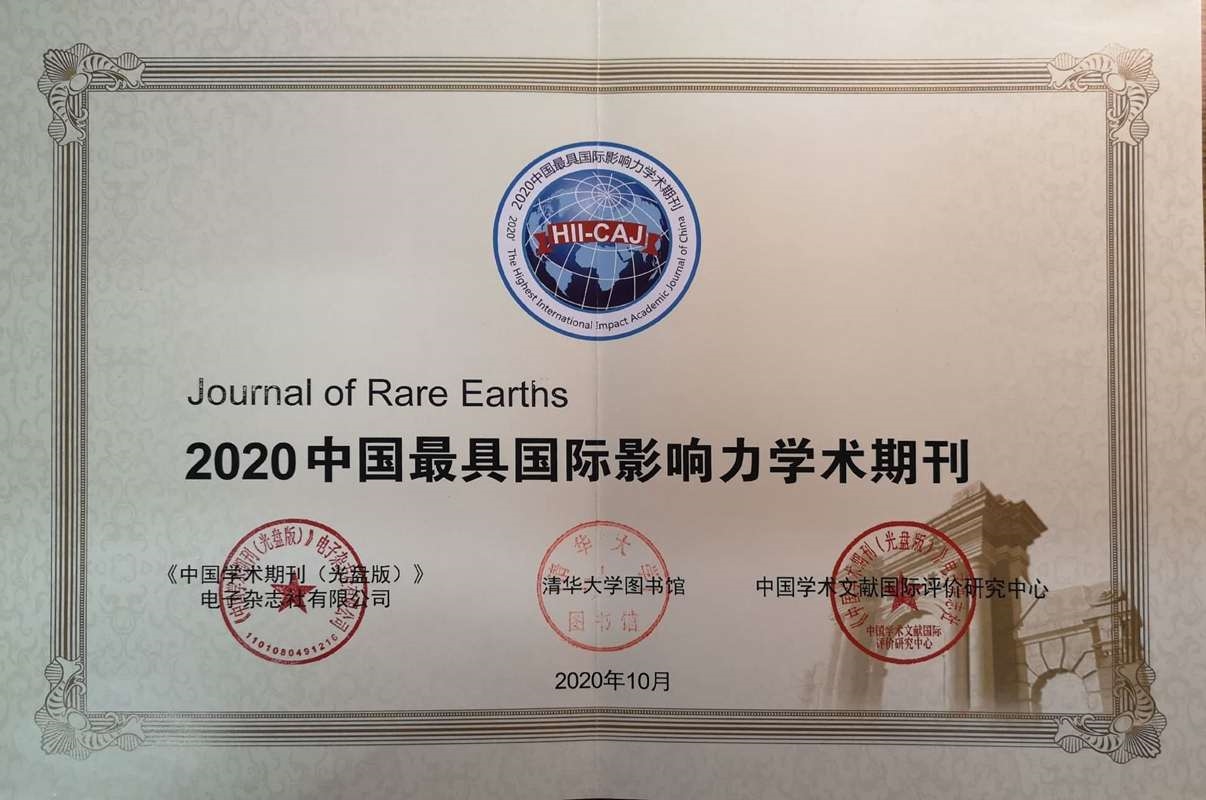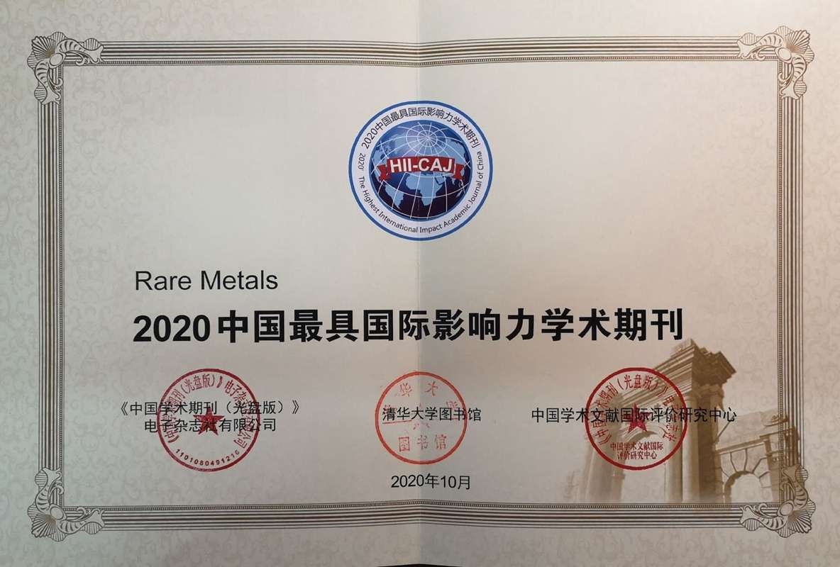 12月17日,有研集团主办的《稀有金属(英文版)》(Rare Metals)、《稀土学报(英文版)》(Journal of Rare Earths)双双入选2020年“中国最具国际影响力学术期刊”榜单,连续9年荣获该称号。