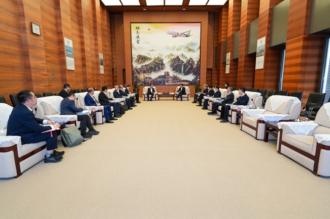 党委书记、董事长赵晓晨带队拜访中国商飞,与中国商飞党委副书记、总经理沈波举行会谈。赵晓晨一行观看了习近平总书记亲切关怀大飞机事业纪实片,深入了解中国商飞在C919、C909等型号研制及产业化进程中取得的重大成就。随后,双方举行座谈会,围绕深化航空材料技术合作、维护大飞机产业链安全稳定等议题进行了深入交流。