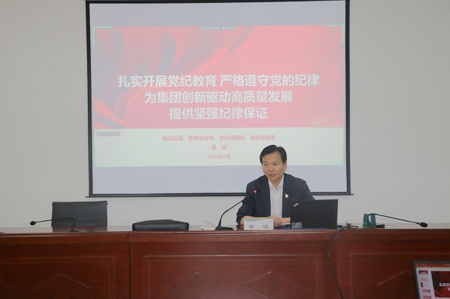 黄倬以《扎实开展党纪学习教育 严格遵守党的纪律 为集团创新驱动高质量发展提供坚强纪律保证》为题,从条例历次修订讲起,阐释条例修订与时俱进、问题导向的特点,突出进一步严明政治纪律和政治规矩、带动各项纪律全面从严,释放越来越严的强烈信号,结合国资央企相关典型案例,详细解读开展党纪学习教育的重要意义、新修订《条例》的主要内容以及《条例》对党员领导干部的新要求,教育引导广大党员明纪、学纪、知纪、守纪。