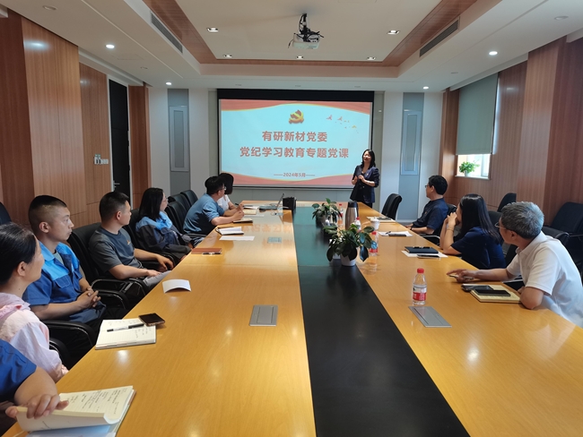 5月30日,有研新材党委委员、副总经理、财务总监、总法律顾问杨阳到有研医疗指导党纪学习教育工作并讲授专题党课。有研医疗领导班子成员及全体党员参加会议。