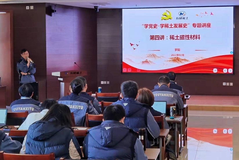 2月21日,有研稀土党总支举办“学党史·学稀土发展史”系列讲座第四讲,磁性材料事业部总经理罗阳教授以《稀土磁性材料》为题做专题报告,讲座由党总支副书记、副总经理许国栋主持。