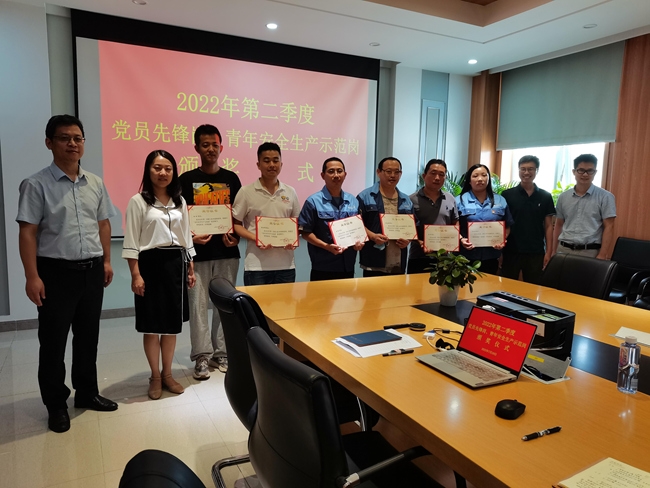 会议还举行了2022年第二季度党员先锋岗、青年安全生产示范岗颁奖仪式。党支部纪检委员兼青年委员、副总经理李君涛宣读了获奖人员名单及其先进事迹材料,领导班子成员为获奖人员颁发了荣誉证书。